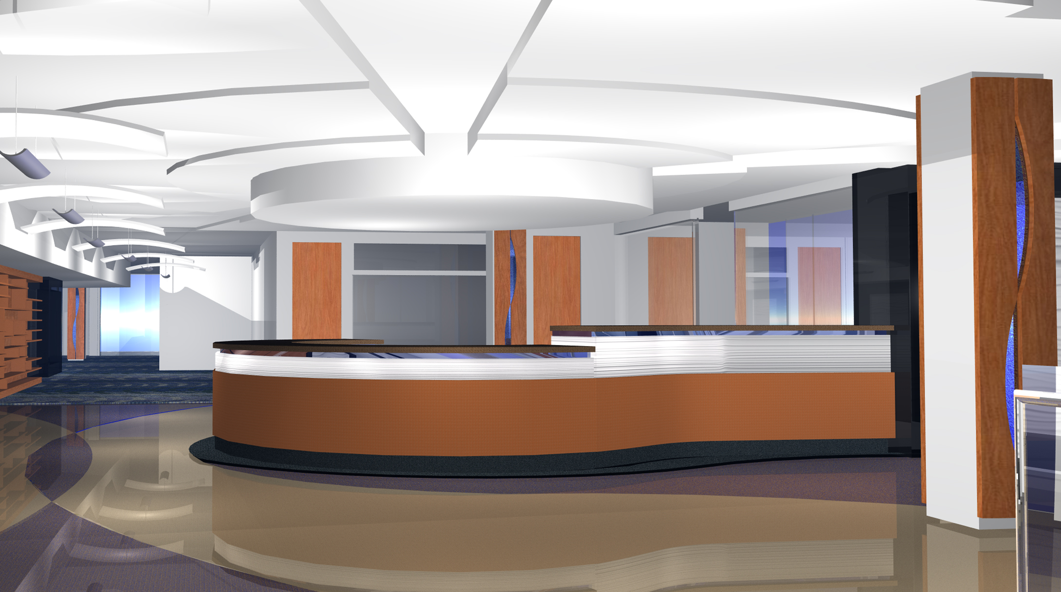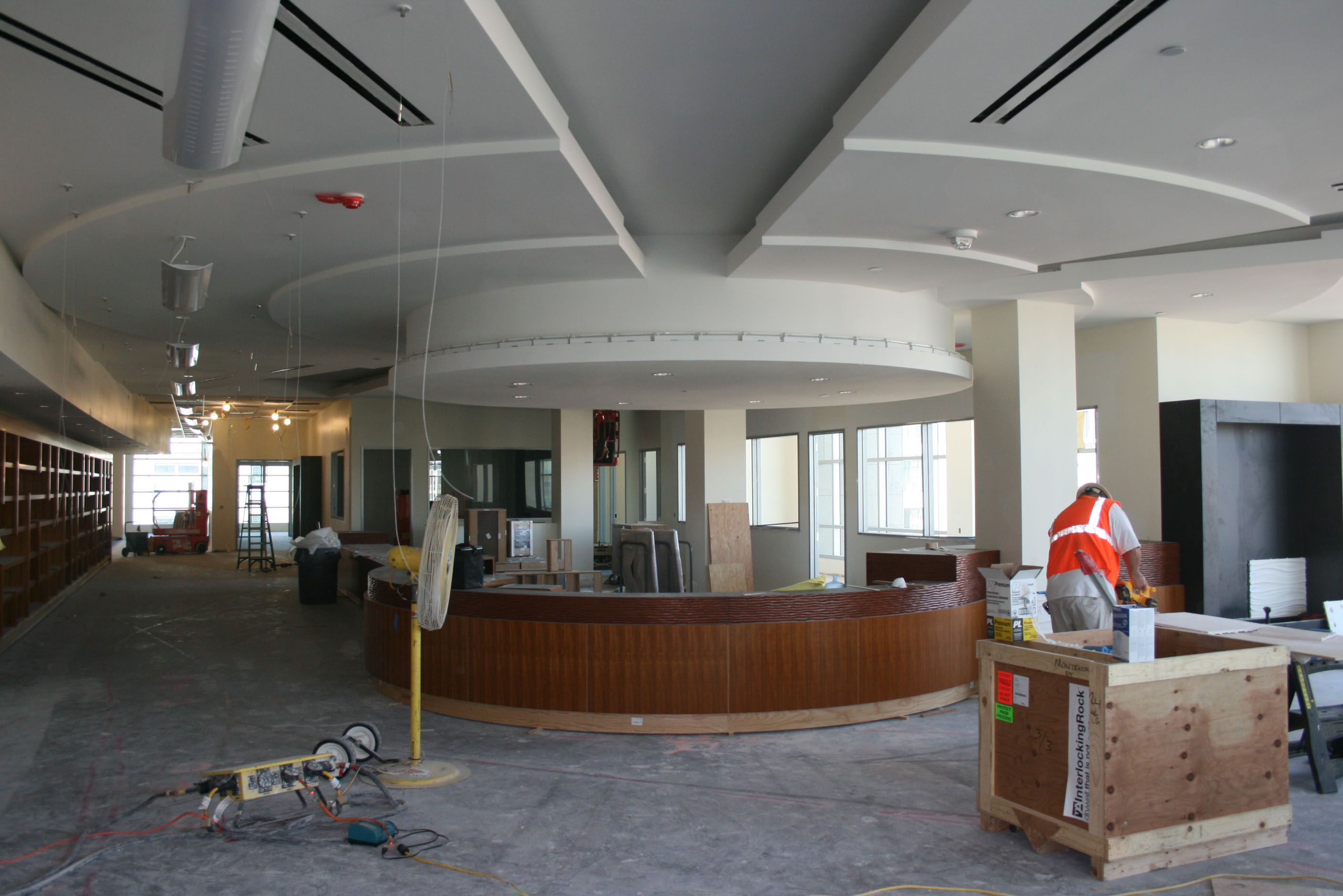 The latest exterior photo of the building looks exactly like the rendering we've been seeing for the past two-plus years.  And the fourth floor library circulation desk has been installed under the flying saucer lighting fixture above it so that it looks almost like the drawing.