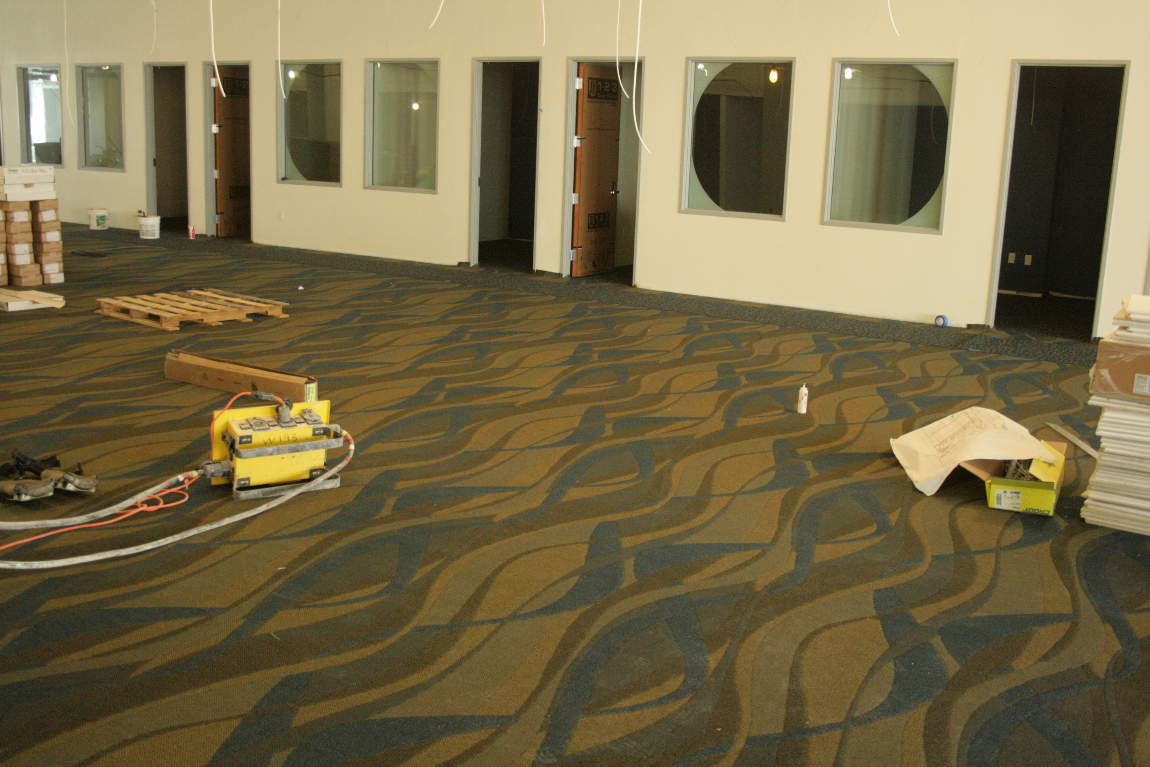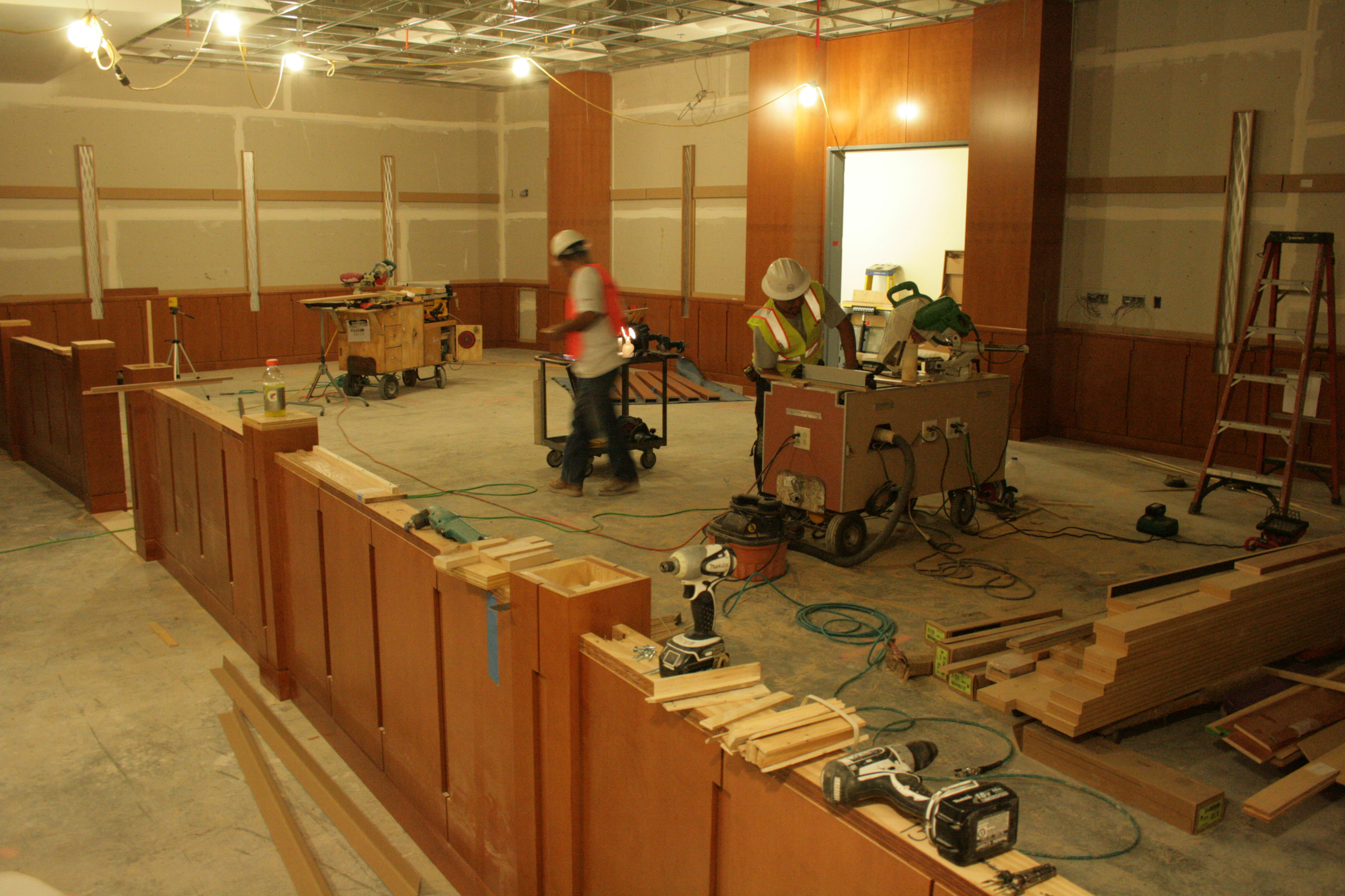 Also in the library, the first carpeting in the new building is being laid down.  The stately and magificent Moot Court room is in the process of having its elegant wood paneling installed.