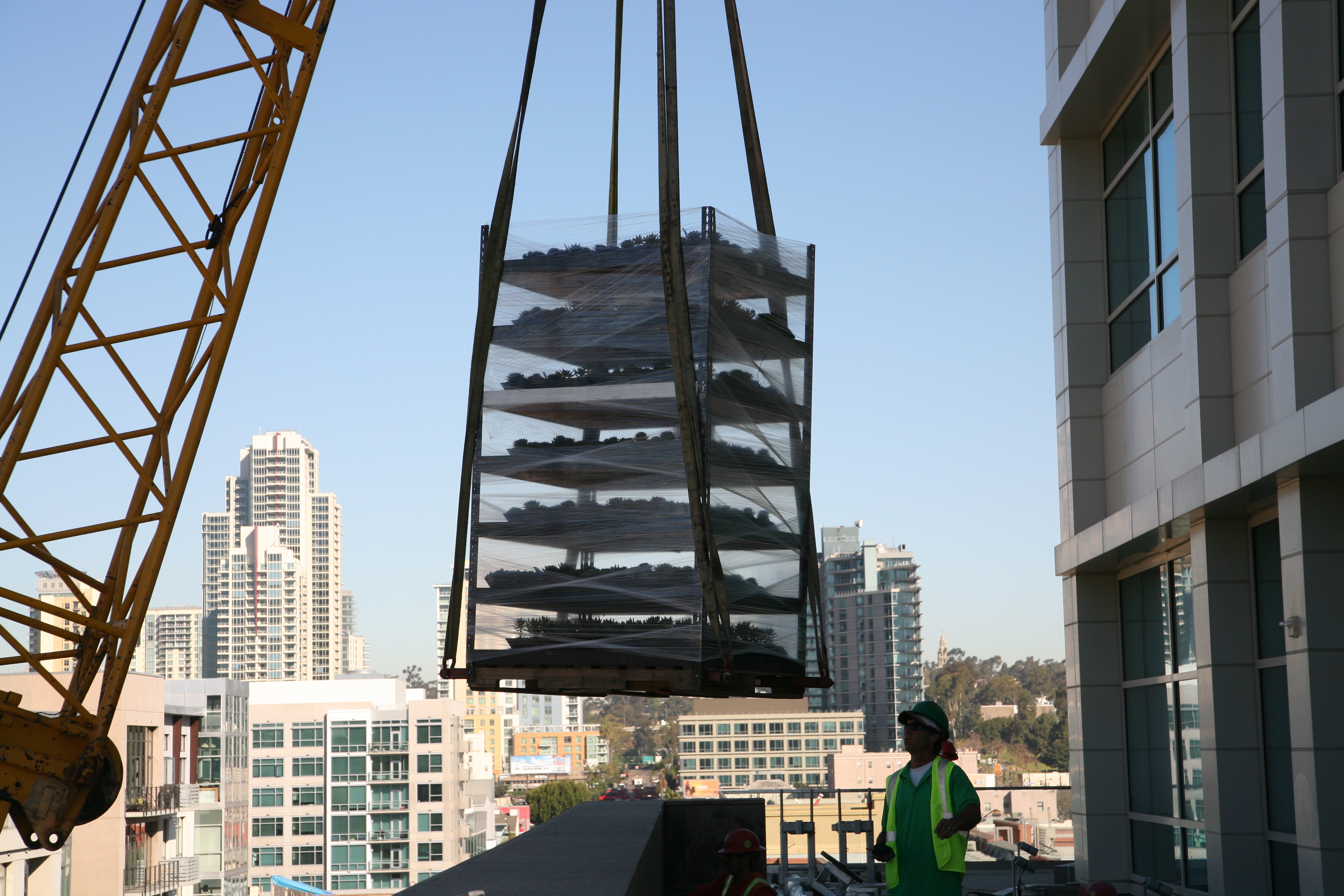 The wall was designed by Mike Szabo of Nowell and Associates Landscape Architecture and the plants were cultivated by Armstrong Garden Centers. Jim Mumford of GreenScaped Buildings installed the plant panels at TJSL on January 27. It is the largest green wall of its kind in San Diego.