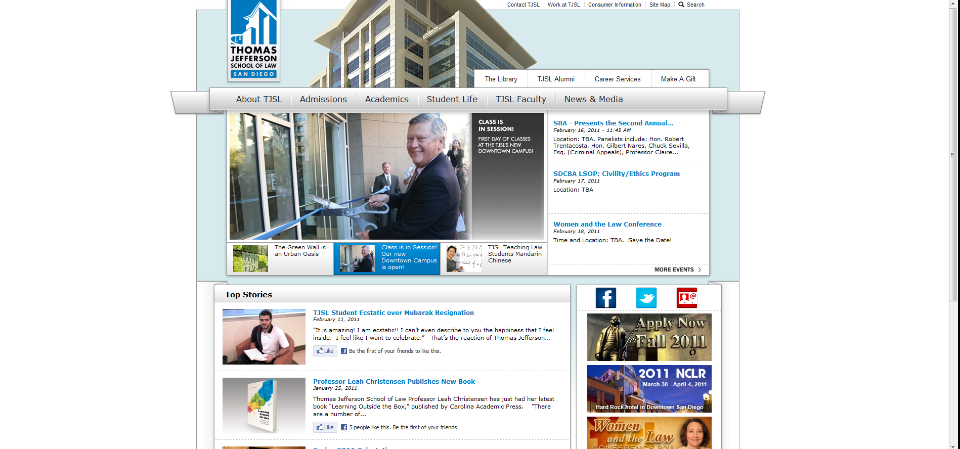 The new website, which was up and running in August 2010, is both aesthetically pleasing and easy to navigate. The homepage illustrates the major transformation TJSL is undergoing by showcasing an image photo of the new campus and featuring stories about the law school’s latest events and accomplishments.