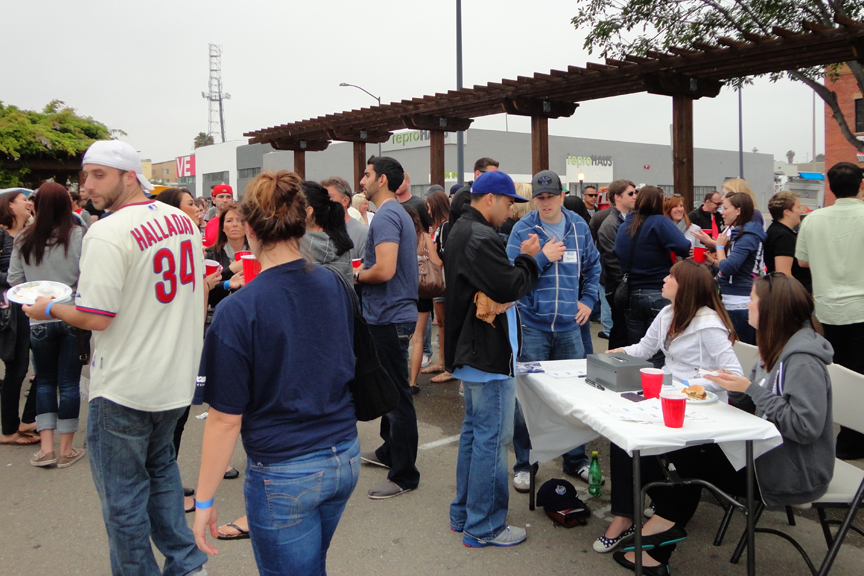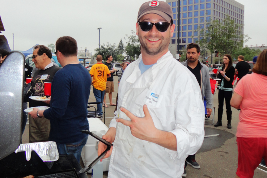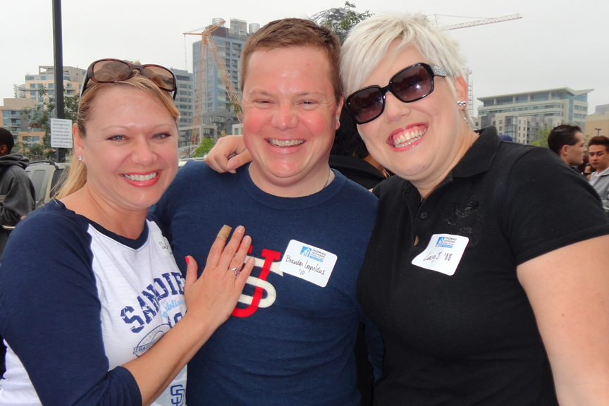 Besides the buzz about the Padres baseball game people were also talking about the fun fact that Michael Weiner ‘09 was in charge of grilling the hot dogs. “Ha ha! It cracks me up that Michael Weiner is BBQ-ing the wieners,” said Michael Jonas ‘09. “As if I haven’t been hearing that all day.” Weiner said. TJSL students, faculty, staff and some admitted students came together on Saturday, April 21, to enjoy the Annual Alumni Tailgate party and to watch the Padres beat the Phillies and Roy Halladay 5-to-1. Past Alumni President Sabrina Green ‘02 once again brought everything together for the tailgate party, including drinks, food and bags of peanuts and M&M’s for the game. Professor William Slomanson was excited that all four of his ’teammates’ were with him to share the day. ”It’s not often that I can spend the day at the ballpark with all of my kids.” Those kids include Lorena Slomanson ‘03 and Michael Slomanson ‘04. Alumni Relations Director, Vanessa Vandever, Alumni Board member Phil Shapiro ‘85 and Director of Admissions, Tim Spearman took a few minutes away from enjoying their nachos to snap a few photos at the game. “I look forward to this event every year, it’s a lot of fun,” Vandever said.