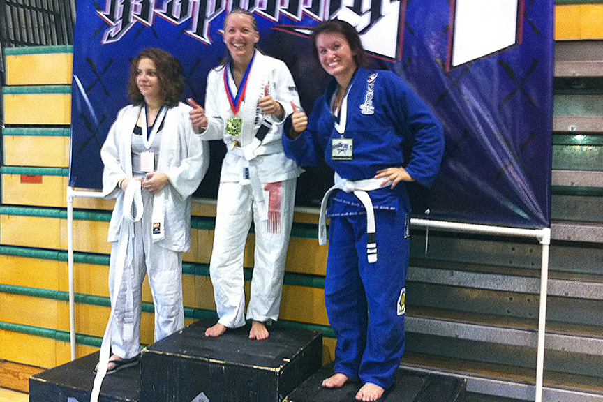 First, I must describe the two different versions of BJJ in which I compete in: Gi and No gi. This refers to the Kimono, similar to what people see in Karate schools, only thicker because it's used for grappling. The No Gi events are much harder because opponents are slippery with the combination of sweat and spandex. When competing with the Gi, the match is a bit slower and you have thick cloth to grab and use against your opponent. I first started competing in No Gi and then I bought a Gi. I hated training with the Gi on because I train with mostly men and once they clutched on, I had no idea what to do. But I forced myself to go every day because I promised myself I wouldn't give up on something just because it was hard. Even more importantly, at the time I started training in Jiu Jitsu I was suffering from a lot of personal problems. I was extremely depressed, but training in the morning and the evening gave me a sense of purpose and direction as well as the necessary endorphins to combat my depression.