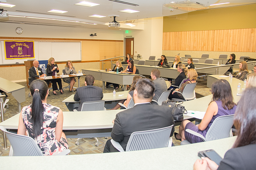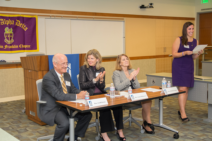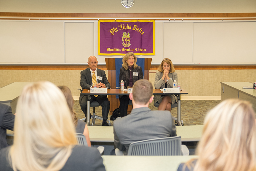 On Thursday, November 14 Phi Alpha Delta hosted its fall signature event “Wine, Cheese and Judges’ Pet Peeves”. The event consisted of an hour-long question and answer session, followed by a reception that allowed students the opportunity to connect with the judges in a more intimate setting. This year’s panel of judges included: The Honorable Gerald Jessop, The Honorable Linda Birkmeyer, and The Honorable Melinda Lasater. Each panelist brought their unique background and experiences.
