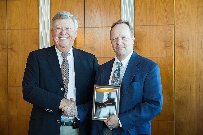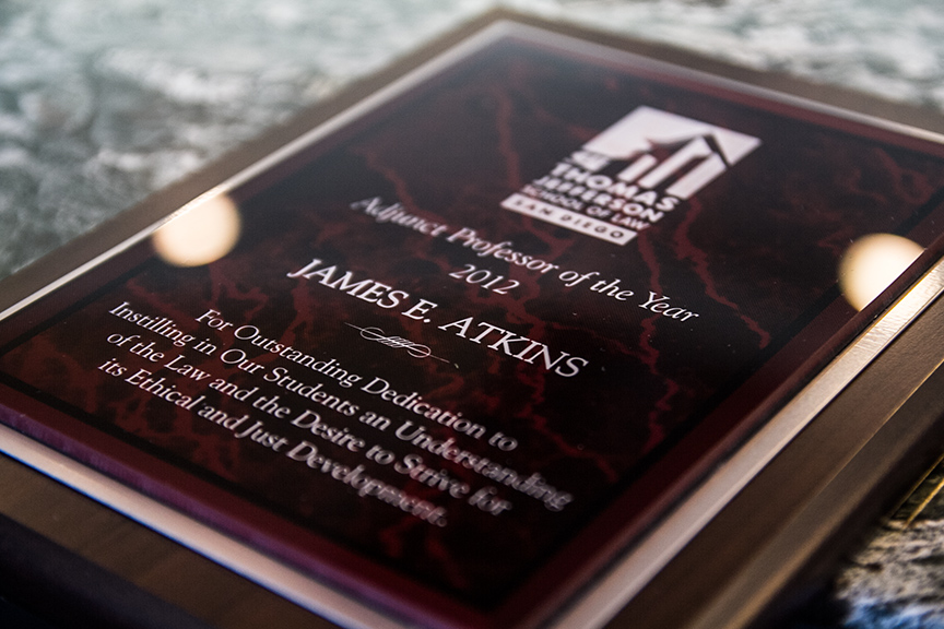 Deputy District Attorney James (Jim) E. Atkins '82 has earned the distinctive title of 2012 Adjunct Professor of the Year. The announcement was made by Dean Rudy Hasl at the annual appreciation reception on April 17 to honor the practitioners who bring their professional expertise to the classroom as adjunct professors at Thomas Jefferson School of Law.