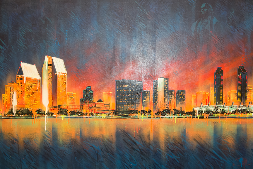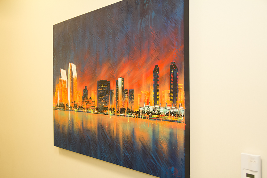 “I’m so excited that my work will hang on campus and allow stressed out students to stare at it and BREATHE,” said Walt. “My inspiration for the piece was the city itself. San Diego is my home town and I am influenced by the vibrant and energetic city life. My style of painting puts an emphasis on movement and depth to create very surreal and dream like images. A new take on traditional landscapes.”