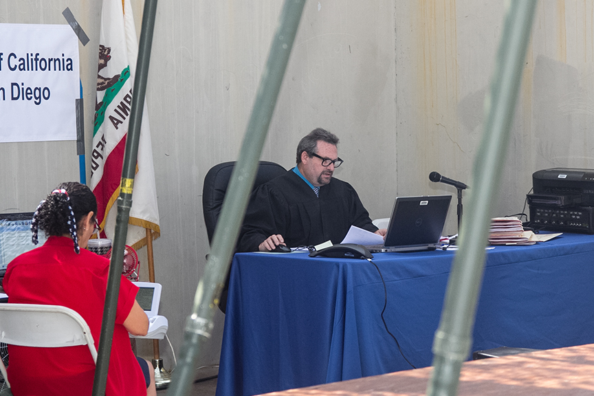 “I’ve never seen an outdoor court before,” said Mary Hardy ’08, a Qualcomm attorney and one of two TJSL alumni who came to represent veterans on behalf of the law school. The court is set up on the handball courts at San Diego High School – a court on the court. “I’m involved because my school is involved,” Hardy said. “It’s the TJSL connection."