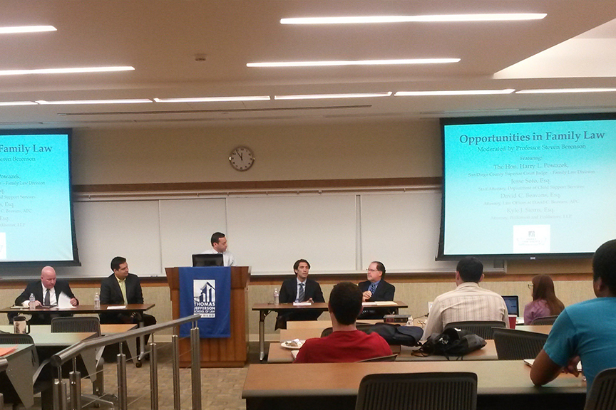 Professor Steve Berenson moderated the panel and brought his own wealth of experience on the subject matter as director of TJSL’s Veterans Legal Assistance Clinic and instructor for the upper-level family law course taught each semester. The panel featured questions posed by Professor Berenson regarding the pros and cons of practicing in this challenging area, the various paths each panelist took to find their current career and general advice each had for students interested in pursuing family law as a career.