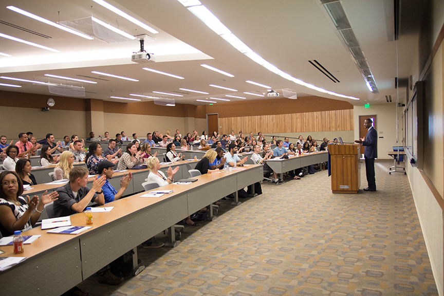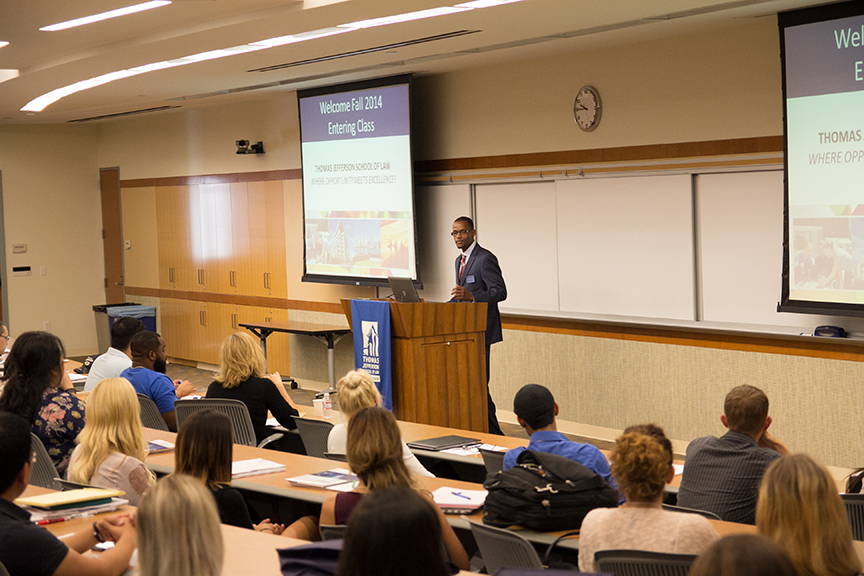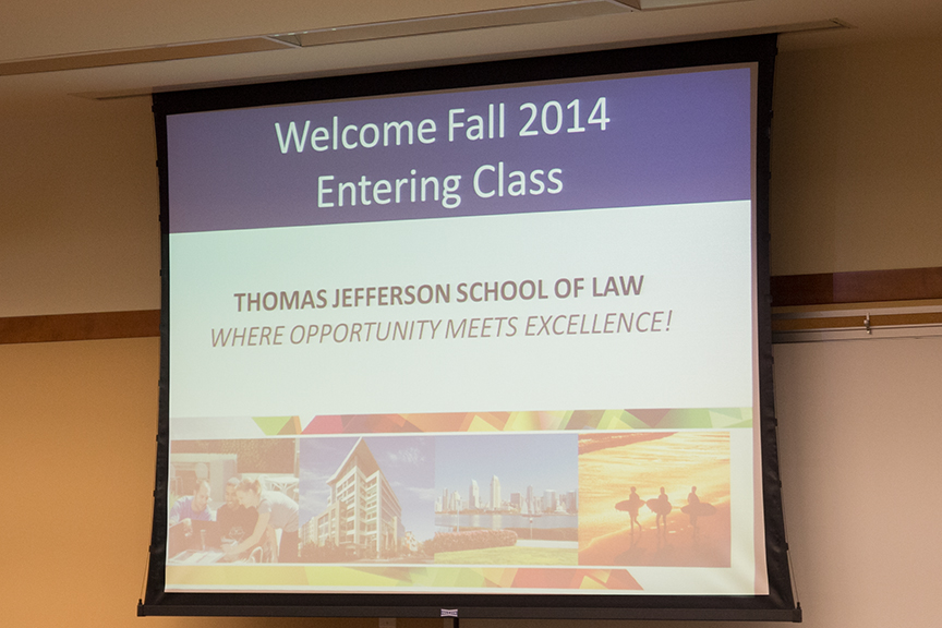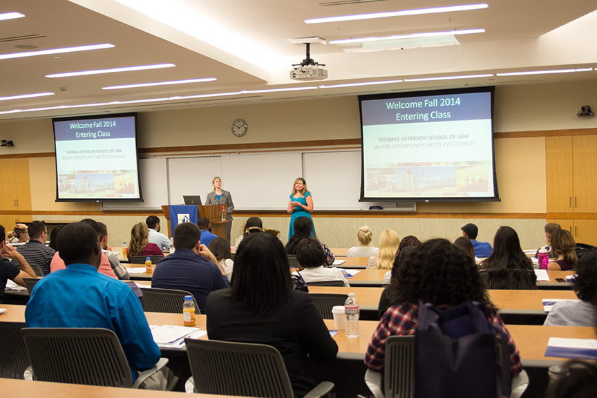 “Before we get started discussing the nuts and bolts of your transition into law school, I think it seems appropriate to take some time to reflect on the decision that you’ve actually made,” said Thomas Jefferson School of Law President and Dean Thomas Guernsey on Monday, August 11 as he welcomed TJSL’s incoming students during the Week One orientation program that helps prepare students for the demands of law school. “You have just made one of the most important decisions of your life. You’ve chosen to become a lawyer, to take on a role and a set of responsibilities that will truly change you forever.”
