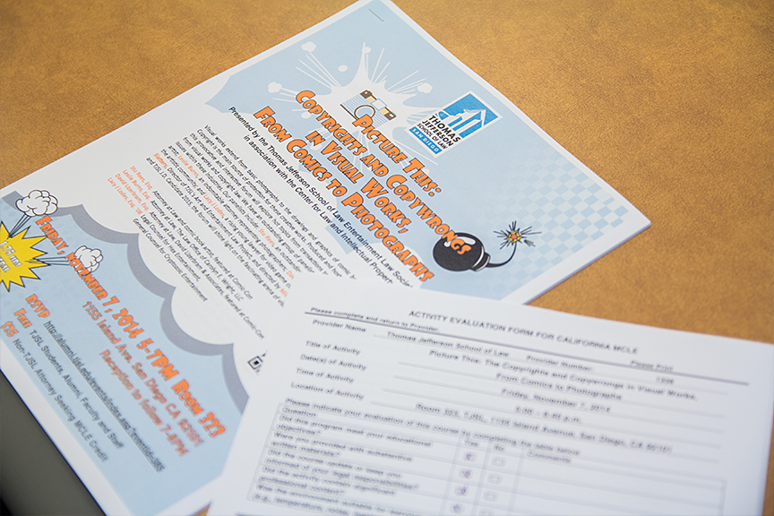 On Friday, November 7, 2014, “Picture This: Copyrights and Copywrongs in Visual Works From Comics to Photographs,” brought copyright experts from around San Diego to TJSL. The two-hour long conference, produced and hosted by Professor K.J. Greene in collaboration with TJSL’s Entertainment Law Society and the Center for Law and Intellectual Property, was followed by a reception for panelists and guests.