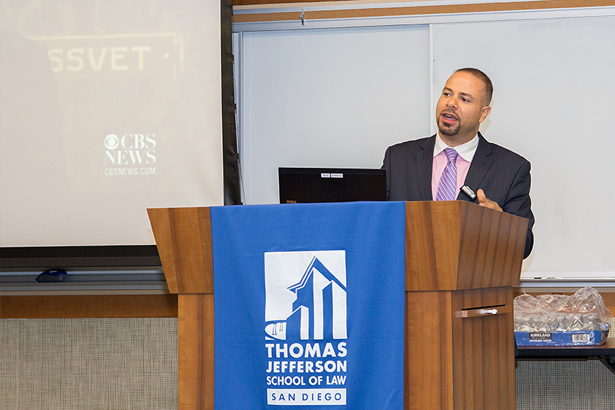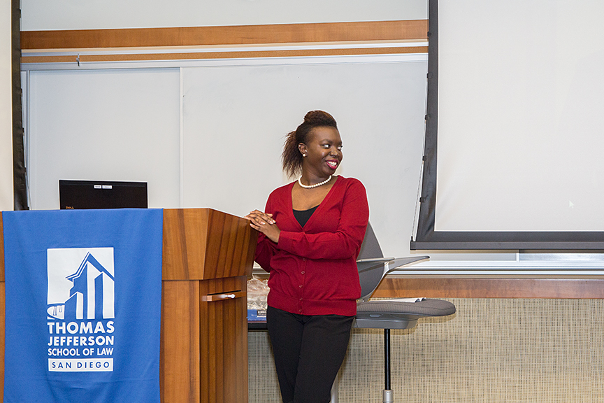 After playing a portion of FBI Director James B. Comey’s recent remarks on the assumptions veteran police officers make regarding citizens of color, panelist, former criminal defense attorney, and international human rights scholar and advocate, Professor Marjorie Cohn noted, “Racial profiling starts at the stop. Who do they stop? They stop people of color. That racial profiling infects the system from the beginning to the end. Who is charged with crime at a greater rate? People of color are arrested, charged, convicted, and receive the death penalty at a greater rate.” Panelist 3L Devendra Raj Ghandi Rajan proposed a closer examination of the implicit biases that affect both law enforcement and communities as a whole. Panelist Kellen Russoniello, a staff attorney with the ACLU of San Diego, introduced to the conversation the controversial implementation of body cameras on police officers. Panelist Mack Jenkins, Chief Probation Officer for San Diego County, responded, “There is a significant movement…to equip officers with body cameras, so that they can see that officers are delivering their services in the way that they’ve been trained.”
