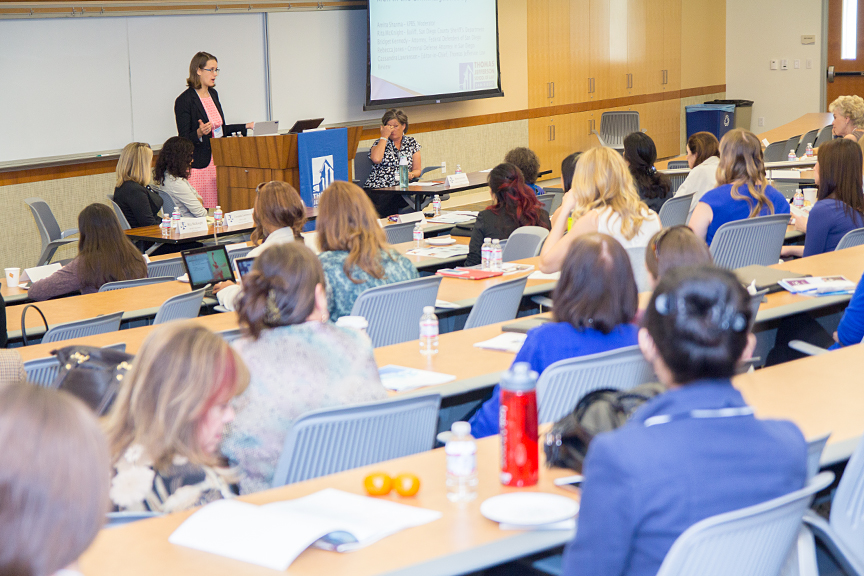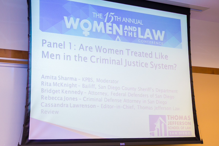 The first panel, moderated by KPBS reporter Amita Sharma, explored the ways in which the criminal justice system treats women differently than men. Speakers on the panel included Federal Defenders of San Diego attorney Bridget Kennedy, San Diego criminal defense attorney Rebecca Jones and Editor-in-chief of the Thomas Jefferson Law Review Cassandra Lawrenson. The discussion included women criminal defendants’ ability to successfully incorporate battered person syndrome into their defense and the hurdles women defense attorneys face arguing these types of cases to bodies of decision makers generally made up of men.