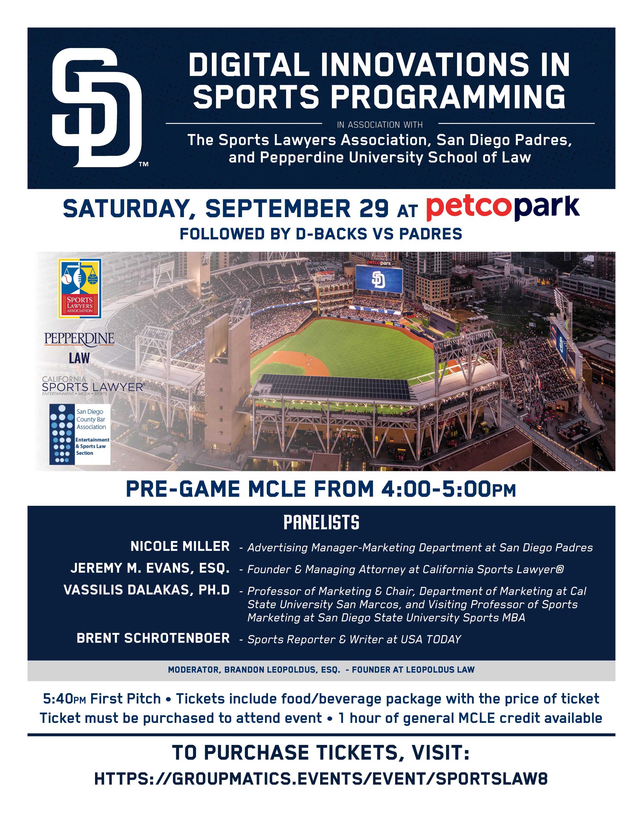 Who: Sports Lawyers Association, San Diego Padres, Pepperdine Law (MCLE provider), and the San Diego County Bar Association (SDCBA) Entertainment & Sports Law Section
