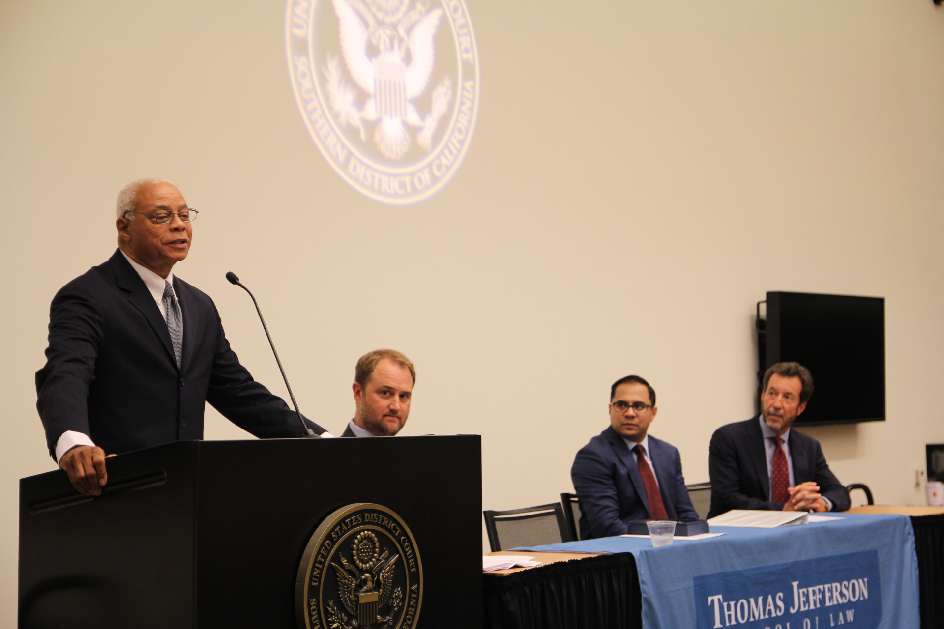 Judge Houston, Senior Judge of the U.S. District Court for the Southern District of California, was honored for his 20 years of service on the federal bench. A native of Greensboro, North Carolina, Judge Houston received his JD from the University of Miami. He began his career in the United States Army Judge Advocate General Corps, and served in the U.S. Attorney's Office, Southern District of California. He became a United States Magistrate Judge in 1998. In 2003, President George W. Bush nominated him to be a United States District Judge for the Southern District of California and he was confirmed that year. Judge Houston took senior status in February 2018. During his time on the bench, Judge Houston has worked with many Thomas Jefferson School of Law students, who have served as his externs and judicial clerks. Indeed, Shannon Laoye ('15) is presently clerking for Judge Houston.