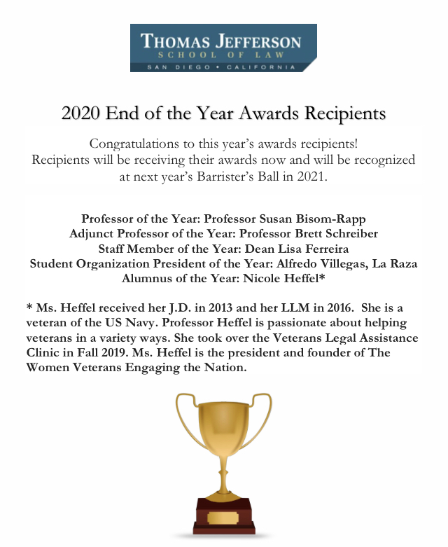 Every year, the Student Bar Association recognizes excellence in the Thomas Jefferson School of Law community. Congratulations to this year's awards recipients: Professor of the Year Susan Bisom-Rapp, Adjunct Professor of the Year Brett Schreiber, Staff Member of the Year Dean Lisa Ferreira, Student Organization President of the Year Alfredo Villegas (La Raza), Alumnus of the Year Veterans Assistance Legal Clinic Director Nicole Heffel. These awards are usually presented at the Annual Barristers Ball, which has been cancelled due to the COVID-19 pandemic. Our recipients will be recognized at the 2021 Barristers Ball.